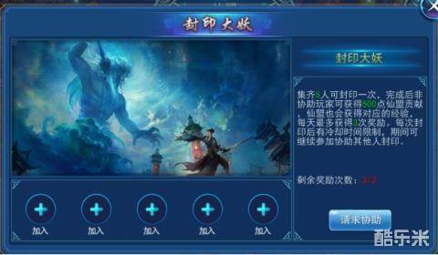 在各位勇士的等级达到35级后,就可以在仙盟的界面里选择封印大妖。在未能凑齐到5位勇士时,可以选择同仙盟的盟友进行协助,邀请盟友一同进行封妖。在封妖完成后,每人将获得500点仙盟贡献,每天最多获得3次奖励。每次领奖后有冷却时间限制,期间可继续参加协助他人完成封印。