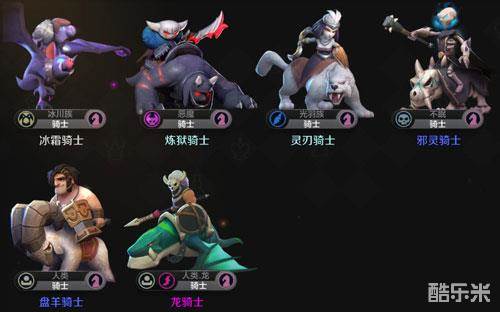 骑士推荐:蝙蝠(巨魔光环必备)、灵刃骑士、邪灵骑士,炼狱骑士(混沌)的恶魔光环和暗影魔王(影魔)冲突,可以二选一上场。不过如果走冰川骑士的话尽量选炼狱骑士,三星的炼狱骑士输出和坦度都是非常强势的。