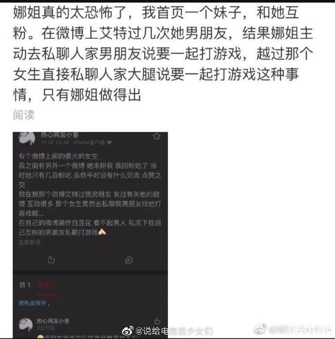 第四条,和一个妹子在微博互粉,看到那个妹子艾特了几次的男朋友,这个女解说鼓鼓看到她男友是个大神,直接越过这个妹子和其男友私聊想一起打游戏。