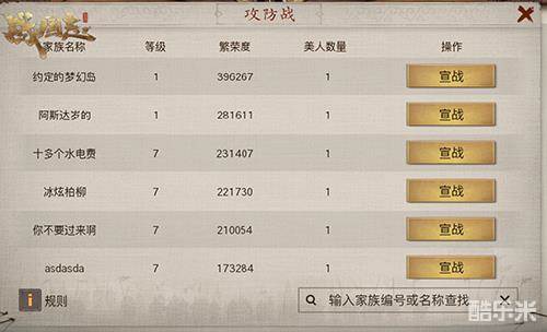 兵戈未息,战火连绵。战场的硝烟弥漫至家族驻地,在千钧一发的时刻,将军定要集结兄弟,共同抗敌。在家族攻防战中本家族家族长、代理族长主掌军事大权,可在家族活动界面中的家族攻防战处点击宣战按钮。