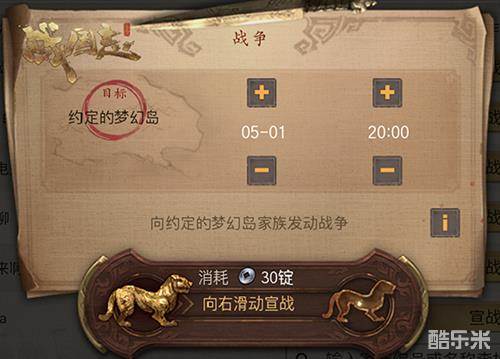 宣战时间可选在当前2小时后到次日24点内,除19点外的任一整点。根据宣战时间的不同,将军发起的家族攻防战分为“普通宣战”和“奇袭宣战”。宣战需要消耗本家族的家族资金,奇袭宣战需要消耗更多家族资金。主动宣战后,需要间隔96小时才能再次发起宣战,被宣战后,需要间隔96小时才能再次被宣战。