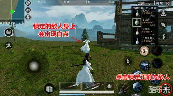 在游戏中我们遇到敌人时,如果直接出招很有可能打偏,所以我们要用到锁定功能,按钮处于屏幕的右下角。锁定之后视角自动跟随的敌人方位,敌人身上会出现白点标识,接近合适的距离就可以出招了。