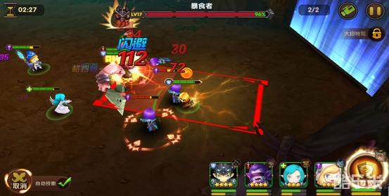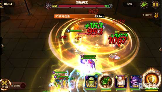 释放技能:每位英雄都有一个主动技能可以释放,可以手动点击技能按钮进行释放也可以选择自动战斗中的自动释放技能进行释放。自动战斗并释放技能能够简化操作过程,但是对于有难度的关卡还是自己来战斗并释放技能是最佳选择。控制技能和回血技能一般要在关键时刻手动释放打断boss技能和提升队员血量。