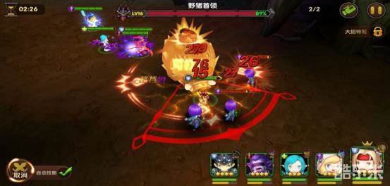 本图中的野猪首领的技能是扇面技能,也是游戏中近战类boss的标志技能之一。此种战斗中,大家需要让主英雄让boss背朝其他角色,自己面对boss,在boss释放技能的时候可以自己躲避技能,让其他角色继续输出和治疗,提高战斗效率,也减少其他角色躲避技能时没有完全躲避开造成的不必要的伤害。