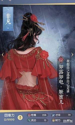 如露如电是遇见逆水寒中角色姬蜜儿的一张卡牌,如露如电·姬蜜儿卡牌属性如何,如露如电卡牌的性情、才华、武功、财力如何,一起来看看吧。