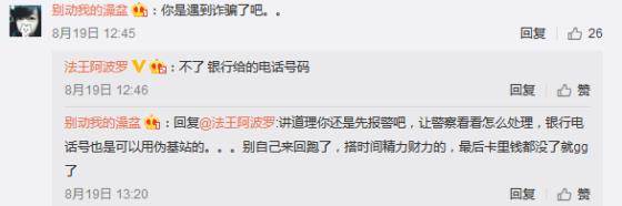 法王粉丝@别动我的澡盆留言:讲道理你还是先报警吧,让警察看看怎么处理,银行电话号也是可以用伪基站的。。。别自己来回跑了,搭时间精力财力的,最后卡里钱都没了就gg了