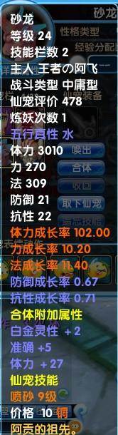 把他炼到60,和60级的砂龙1合,用30元宝的固本符,这时候砂龙差不多8.30左右的力,10.30左右的法!T差不多80到85加,就是75加也没事!