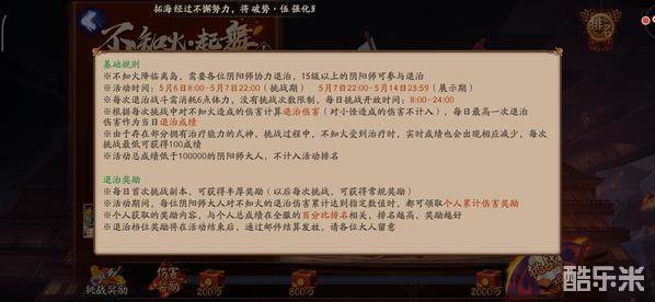 可以看到该活动只有6日到7日两天,也就是说想要奖励的玩家需要抓紧时间哦!挑战时间为:8:00到24:00,同时每次挑战需要消耗6点体力,每日成绩为最高一次伤害,所以不需要一直去挑战的,这里阵容方面,小编推荐追书丑,搭配酒吞、食发鬼。(看排行榜就知道了)