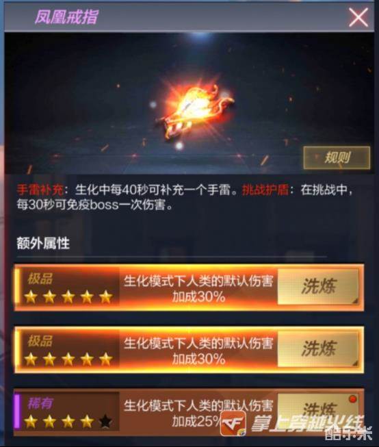 凤凰戒指对打僵尸的作用不言而喻。不仅能补充手雷,还有提高对僵尸的伤害。洗练过后,最高提高百分之九十的伤害,使你先天比别人伤害就高了一大截。有这样的戒指在手,还需要担心打不过生化僵尸么?