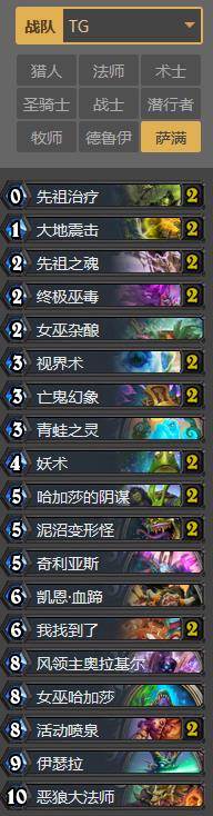 新版本以来,萨满虽然失去了火山喷发,但补充了哈加莎的阴谋这一优质AOE以及活动喷泉这一集解场和回血为一体的满分白卡,因此抗快攻能力不降反升。而先祖治疗作为一张能够与活动喷泉完美配合的法术,也在沉寂许久后重新进入了构筑之中。由于携带有大量的高质量生物,大哥萨在面对防战时也处于优势。在天梯和比赛中,大哥萨主要作为控制卡组,食粮为防战、动物园和近期崛起的机械猎。