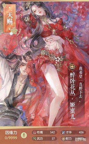 醉卧花丛是遇见逆水寒中角色姬蜜儿的一张卡牌,醉卧花丛·姬蜜儿卡牌属性如何,醉卧花丛卡牌的性情、才华、武功、财力如何,一起来看看吧。