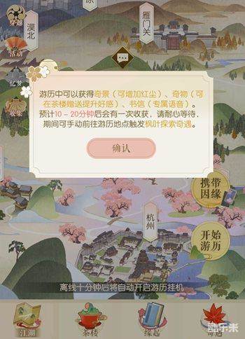 1、在【江湖】中选择【开始游历】,游历过程中每10~20分钟会有一次收获,有几率可获得奇景。