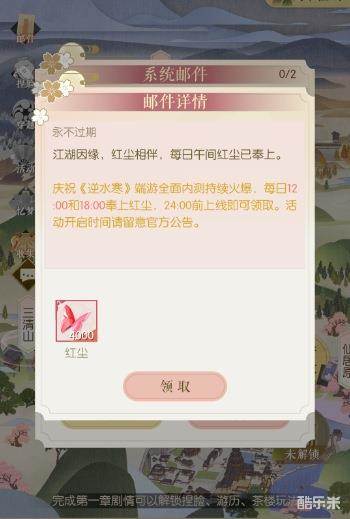 ③ 在邮箱-每日红尘中,每天12点、18点可领取一次红尘点;
