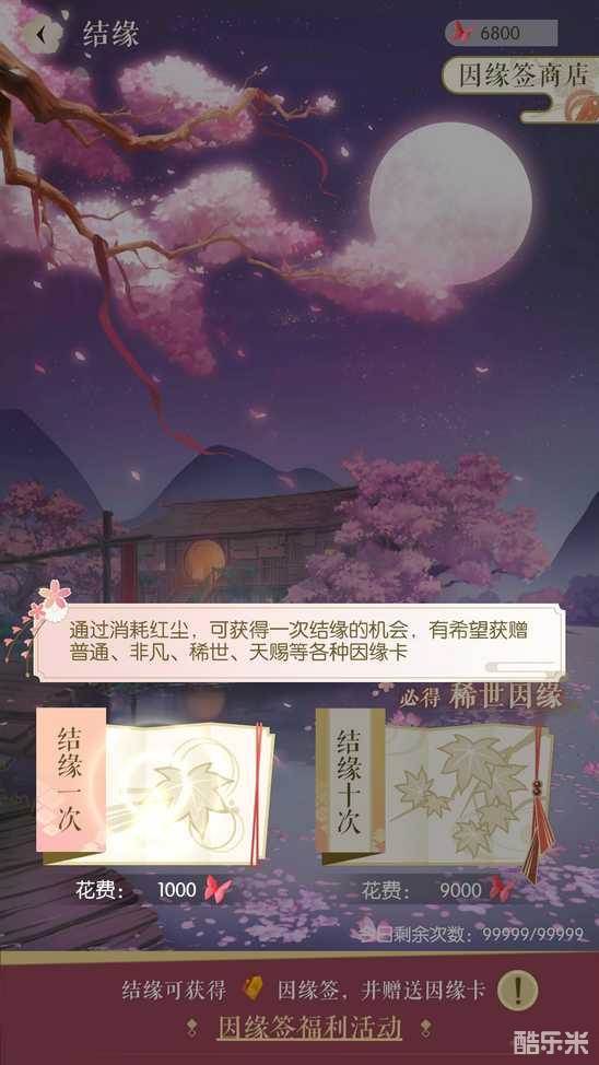 进入结缘后,每消耗1000点红尘可结缘(抽卡)1次,消耗9000点红尘可结缘10次(必定得稀有因缘卡)。