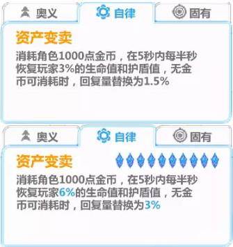 消耗角色1000点金币,在5秒内每半秒恢复玩家3%(6%)的生命值和护盾值,无金币可消耗时,回复量替换为1.5%(3%)