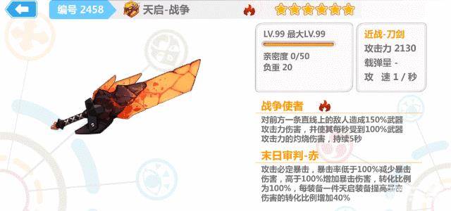 天启·战争在天启梦魇中有几率掉落~非常帅气和有质感的一把“大”刀呢,攻击范围也是非常的大,对击中的敌人会附加灼烧效果,并且有着必然暴击和暴击率转换为暴击伤害的神奇特性。真要说缺点的话,那就是攻击速度比较慢啦ヽ(≧□≦)ノ