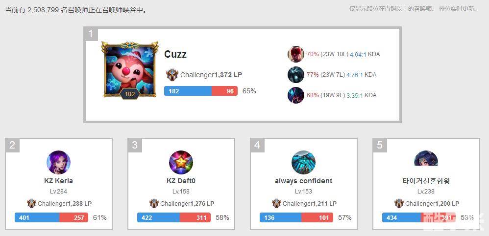 最近,MSI季中赛正在火热展开,各赛区的冠军战队都在积极备战,而没有进入MSI的战队,就进入了一个短暂的休赛期,在休赛期,选手们在休息过后,纷纷开启上分模式。截止今日OP.GG统计显示,韩服前三名被KZ战队包揽,第一名是KZ打野Cuzz,第二名是KZ替补辅助Keria,第三名则是KZ的AD选手Deft。