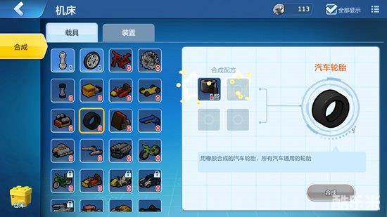 制作轮胎我们需要准备机床,橡胶。机床可以在工作台上合成,橡胶可以使用树脂在炼金台上合成。