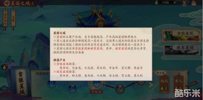 单人通关后将会解锁更高一层关卡,且被单人通关的低层关卡将支持阵容锁定功能(借助灵府成员符灵通关时,无法解锁更高一层关卡)星宿之城分为贪狼星域和破军星域,其中,军星域难度非比寻常,挑战前请做好充分准备。