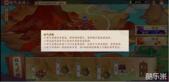 妖气试炼分为普通,困难两种模式。每种模式有40层副本。
