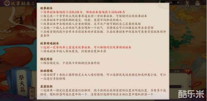 故事副本中会随机刷新通宝、经验、星宿不同加成的敌人。简单副本每场战斗消耗3体力,困难副本每场战斗消耗4体力。
