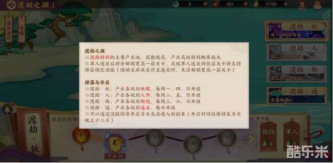 渡劫,妖:产出各级别妖蝶,每周一、四、日开放渡劫,人:产出各级别人华,每周二、五、日开放崇渡劫.衡:产出各级别衡镜,每周三、六、日开放渡劫.通:产出各级别通石,每日开放可以通过消耗绢帛开启当天无法进入的副本