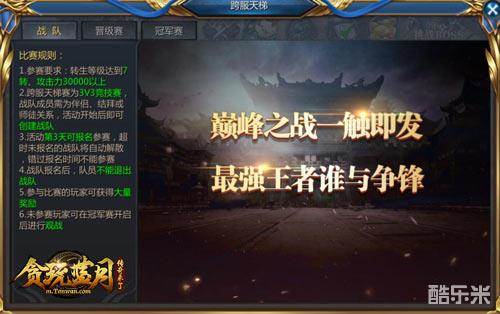 4.26-5.4日《贪玩蓝月:传奇来了》举办了跨服天梯赛,参与比赛的玩家均可获得大量奖励,其中不乏有寒铁、大量荣誉等。冠军队伍更能获得永久称号【战神-天地主宰】。5.4日的天梯赛决赛更是将此次活动推向了最高潮,此次更是百万玩家共同见证了天梯赛冠军的诞生。