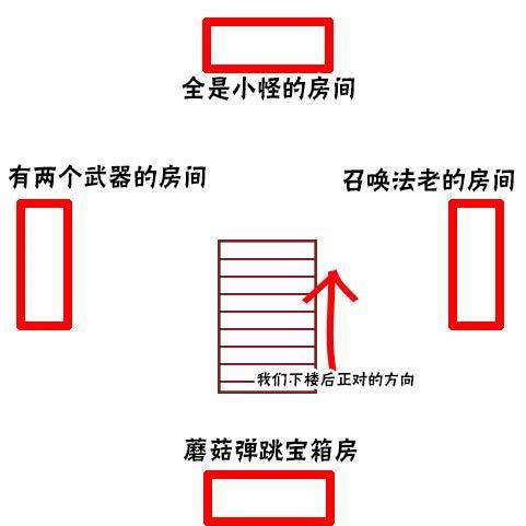我们以下楼正对方向为参考,小编画了四个房间的俯视图。(暂不清楚金字塔四房间内是不是随机刷新,但是存在的物品应该是一定的)