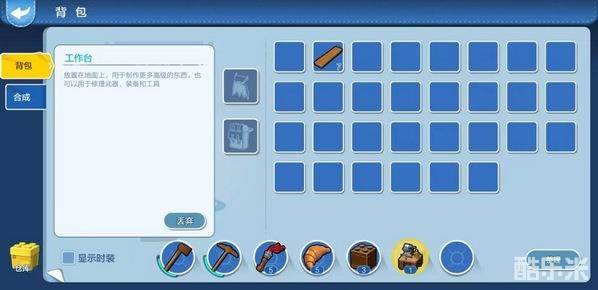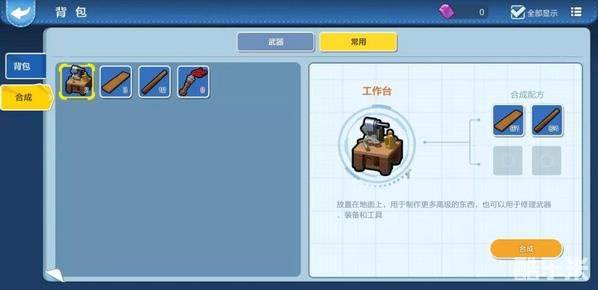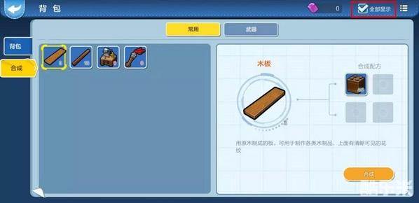 工作台是创造者们合成/制作道具的必备道具,那怎么搭建呢?在我们获取木块后,只需打开右下方背包,点击合成选项卡,勾选右上方的全部显示,即可查看当前可合成物品。
