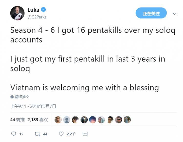 今日,G2战队的Perkz选手发推特称自己在越南服Rank时豪取五杀,他觉得越南真的很欢迎他。
