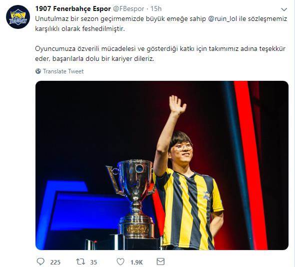 来自土耳其赛区的1907 Fenerbahçe Esports战队官宣队内上单选手Ruin离队的消息:
