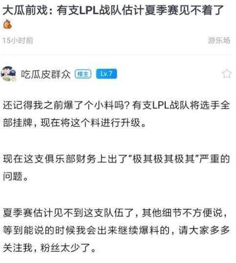 5月7日凌晨,有位知情人在某论坛上爆料:有一支LPL战队,因为现在出现了严重的财务问题,已经将全部选手挂牌出售,夏季赛大概率是见不到了。