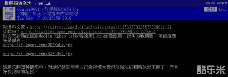 HLE战队打野选手、前闪电狼韩援Moojin今日被曝出私下勾引未成年女粉丝交往、性骚扰暗示、以及对外泄漏队内情况。LMS网友将曝光的聊天记录进行了翻译整理。