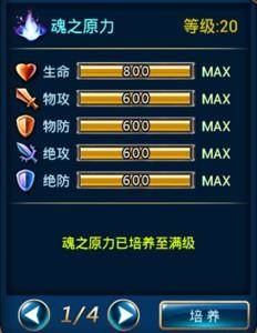 3. 培养界面主要显示四个主属性的名称,等级,带来的具体属性加成值,以及角色等级是否符合升级条件,当角色符合升级属性条件时,即可对角色的相应属性进行升级操作。