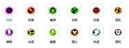 混乱、瞬移击退、毒雾、强力、快速、厚皮