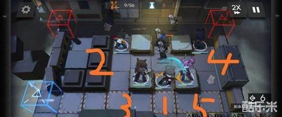 按费下干员。开局1、2位下先锋,没得选。有费之后3号位下狙击帮忙输出。4号位下个扛线的,5号位再补个输出,脸朝左。