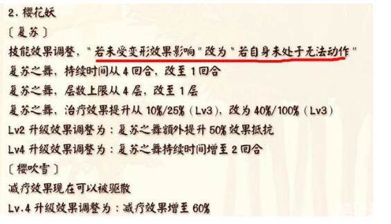 新追加的樱花妖改动内容很简单,追加了一条二技能的技能效果调整,从“若未受到变形修购影响”改为”若自身未处于无法动作“同时二技能的lv2级提供了一个额外50%的效果抵抗能力。