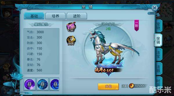 坐骑潜能:玩家仅能通过使用宠物潜能丹来提升潜能,每使用一个则潜能提升1点;