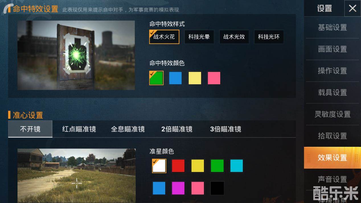 《和平精英》游戏中提供可根据个人喜好设置命中特效的功能。选手可在设置系统-效果设置页签中,选择4种命中特效样式组合4种命中特效颜色共计16种的搭配,选手还可以在训练场中打靶体验所选择的命中特效。
