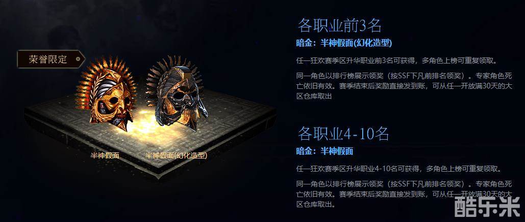在丰厚时装奖励的基础上,我们还将赠送流放者珍贵限定暗金装备“半神假面”和“半神假面(幻化造型)”,元素抗性增加,全属性提高,角色体型增大,快来获取吧!