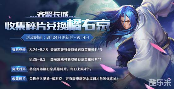 8月24日~8月28日,5级以上玩家每日登录游戏可领取橘右京英雄碎片*3