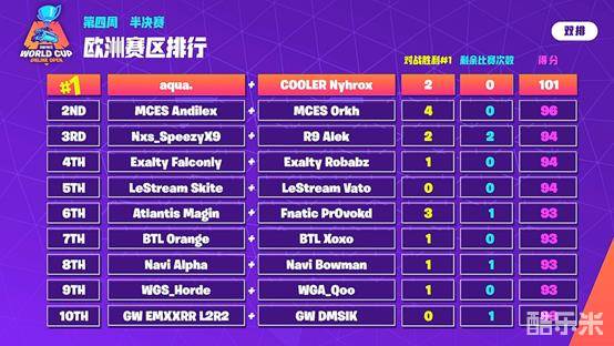 从欧洲赛区半决赛前十名单上看,前三周距离晋级很近的选手还在努力,还有一些黑马继续冲到了最前,比如aqua.和COOLER Nyhrox,他们获得了欧洲赛区半决赛第一名,相信他们在第二天的决赛中也会有不错的表现,期待他们的发挥!