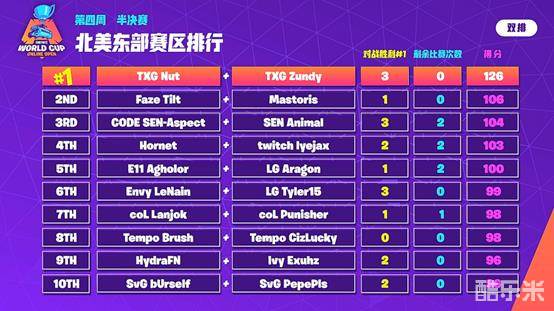同在北美东部赛区的TXG Nut和TXG Zundy没有Ghost Bizzle两人名气大,但是他们在堡垒之夜世界杯的舞台证明了他们的实力。TXG Nut及其队友在异常混乱的高处取胜,TXG Nut最后精准一喷,收获#1。并且,TXG Nut和TXG Zundy最终以126分,获得北美东部半决赛第一名,相信他们在决赛会有更好的成绩。