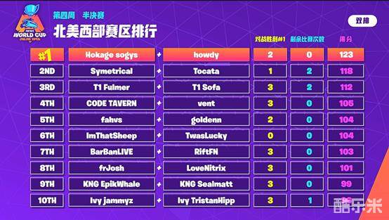 北美西部赛区高手云集,很多知名选手都在这一赛区,比如Ghost Aydan,但是Hokage sogys和howdy、以及T1 Fulmer和T1 Sofa却是第四周北美西部半决赛的主角,四名选手名声不显,竟是获得了北美西部赛区前三的成绩。