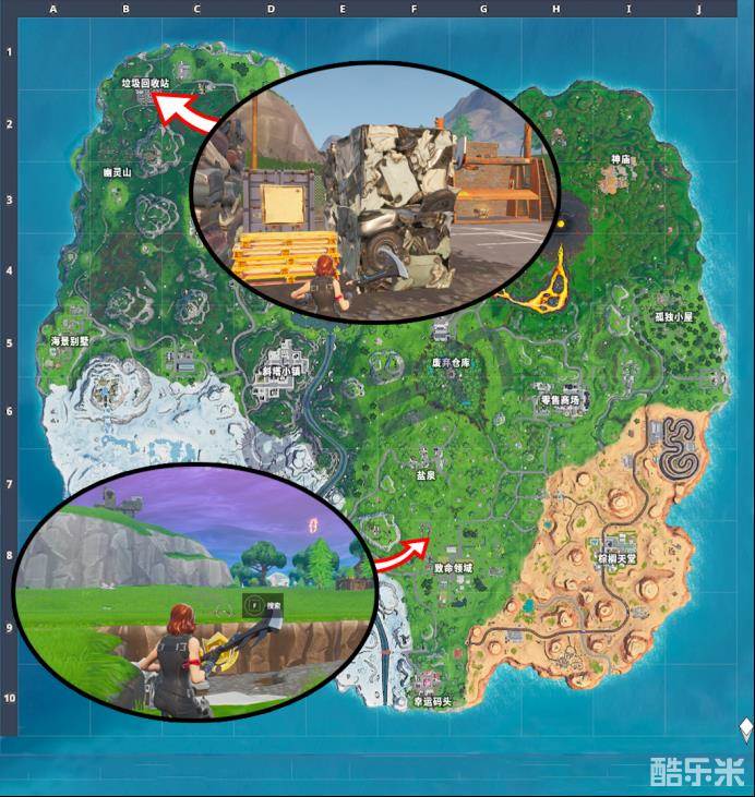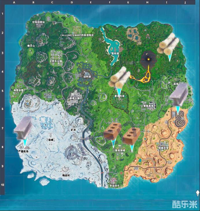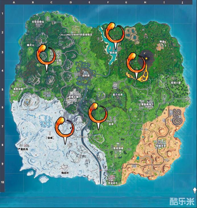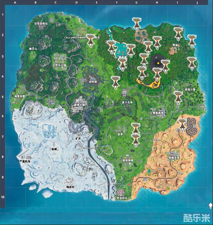 火山喷泉的任务在这个赛季基本每隔几周就有,位置给大家标注在图上了,大家可以考虑在火山附近去完成这个任务,火山附近的喷泉比较多哦!