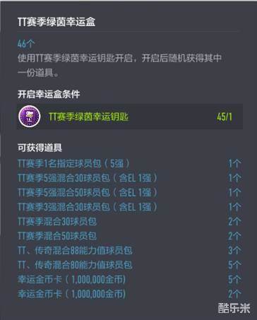 幸运盒说明:TC赛季绿茵幸运盒需使用TC赛季绿茵幸运钥匙开启,开启后随机获得以下一种奖励: