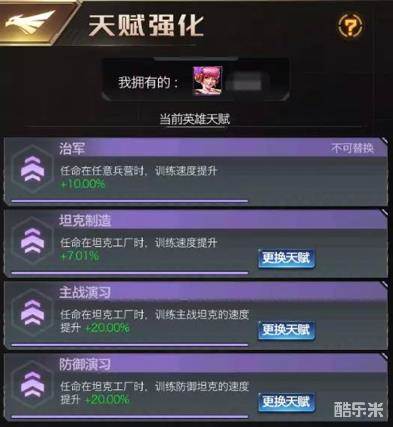 主战坦克训练+138.36%,防御坦克训练+138.36%,单次训练数量+789。