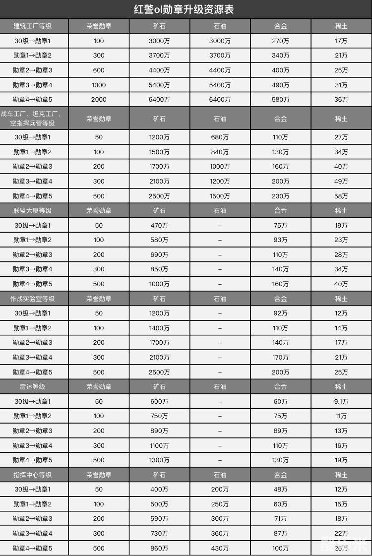 提升勋章等级,除了需要矿石、石油、合金、稀土这些基础资源以外,还需要数量不等的专用道具“荣誉勋章”。下面就是红叔整理出来的所有需要荣誉勋章进行勋章升级的建筑资源所需量。
