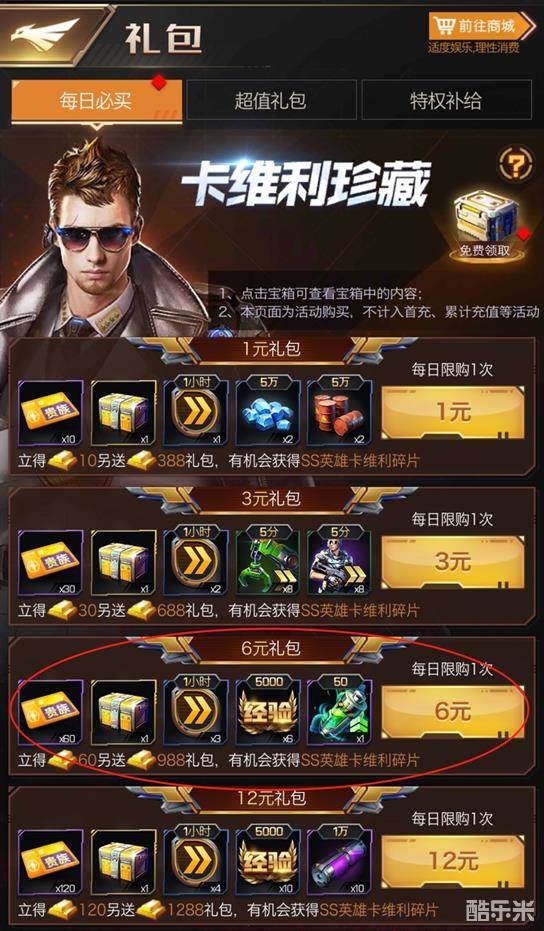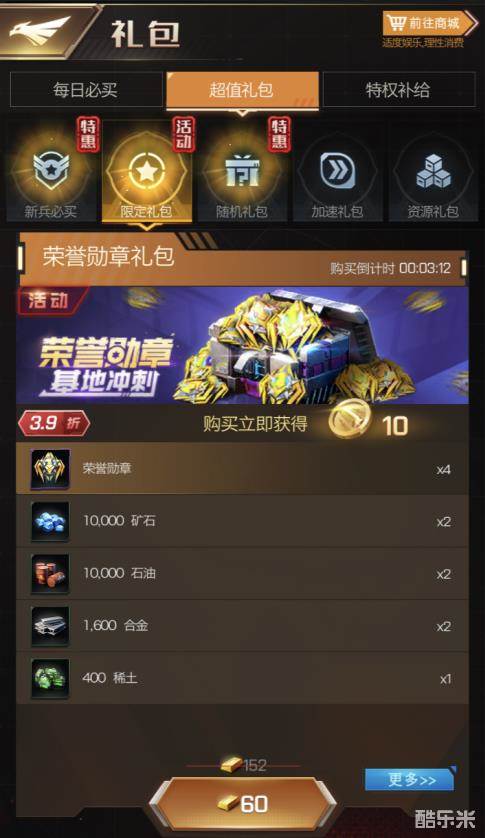 “荣誉勋章礼包”是当前版本最直接的获取勋章活动,购买6RMB的“荣誉勋章礼包”可得4个荣誉勋章和大量基础资源。