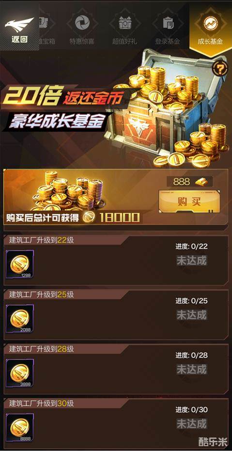 而通过购买“成长基金”获取金币也不失为一种明智的选择,价值888金条的“成长基金”在建筑工厂等级升至30级后共可获得18000个金币,20倍返还金币。